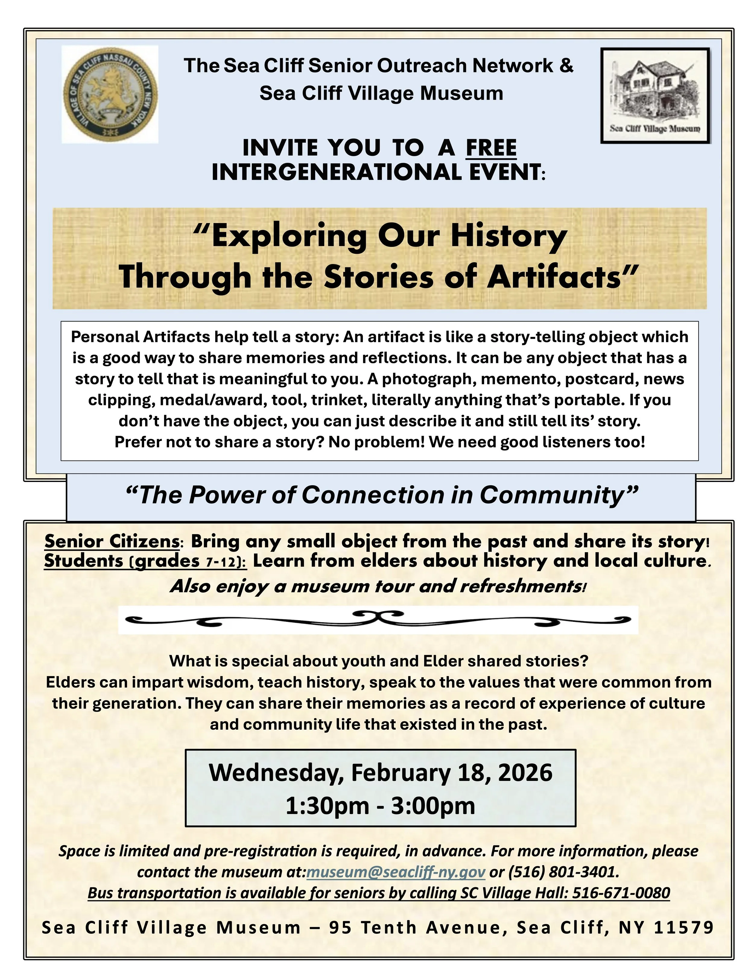 Join us on February 18, 2026 as Sea Cliff’s seniors share their stories and their cherished artifacts.